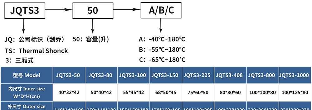 三廂式冷熱沖擊試驗箱型號命名及參數表