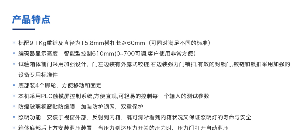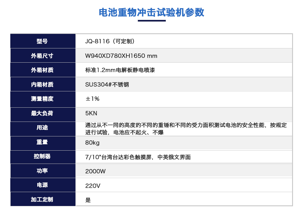 產品型號:JQ-8116(定制款) 品牌:劍 喬 用途:電池重物沖擊試驗機是模擬通過從不一同的高度的不同的重錘和不同的受力面積測試電池的安全性能,按規定進行試驗,電池應不起火、不爆炸。也是各電池廠家及研究所必不可少的檢咨詢熱線:13829135130